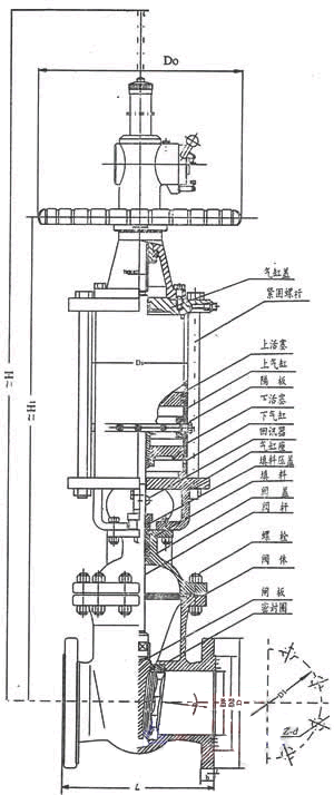1、 本閥主要由閥體、閥蓋、閘板、閥桿、密封圈、雙層氣缸及其活塞、活塞桿、隔板連同緩沖機(jī)構(gòu)、手動機(jī)構(gòu)、氣動-手動轉(zhuǎn)換裝置和閥蓋填料裝置等部分組成。